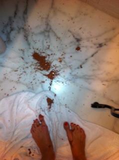 Those who know me really well are all too familiar with my Plays of the Day or PODs (shortened out of necessity because they are, in fact, daily). Last night, while everyone was enjoying their extra hour of sleep, I was scrubbing bronzer out of my toenails. Because I’m not known for my grace or coordination, it may not surprise you that this photo is from me accidentally shattering a $23 bottle of Prescriptives bronzing liquid and not the result of a home invasion ordered by Brian.
